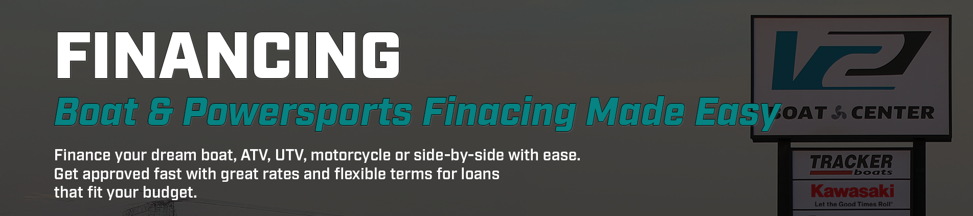 At V2 Boat Center, we’re passionate about helping customers experience the freedom of the water and the thrill of the ride. Whether you're looking to finance a new boat, personal watercraft, ATV, side-by-side, motorcycle, or Kawasaki powersports vehicle, our finance team is here to make the process simple, fast, and stress-free.